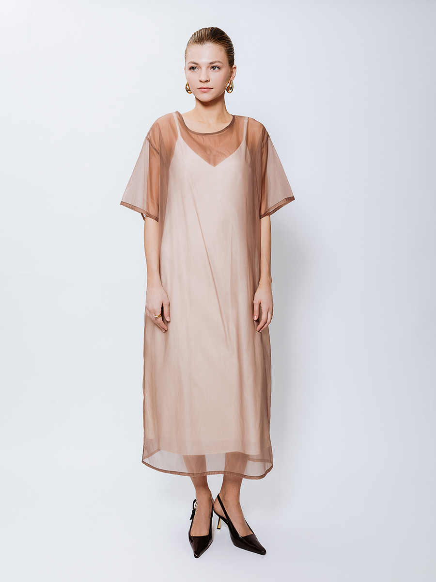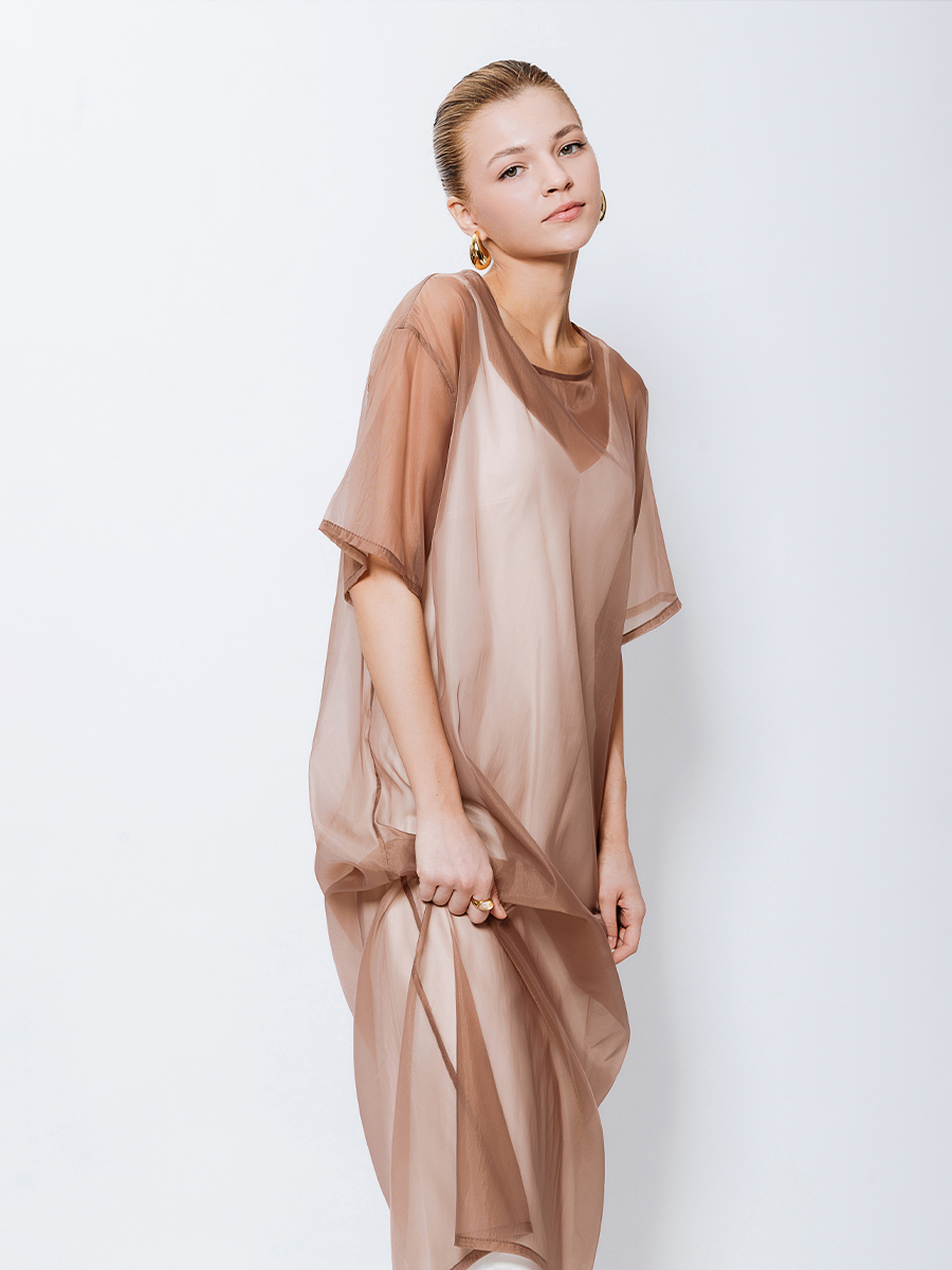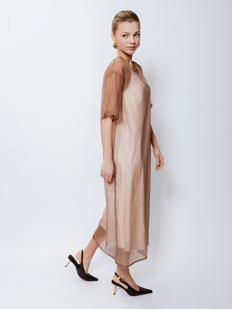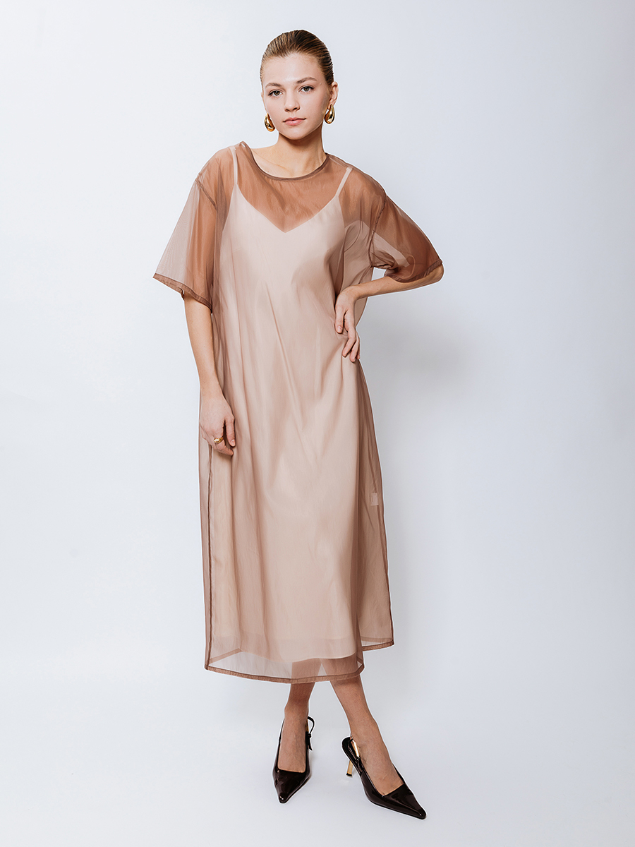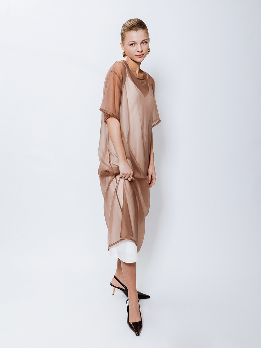 Широкое платье из коричневой органзы. Рукав-фонарик 3/4, круглый вырез. Носите поверх базовых платьев и комбинаций, а также в необычной стилизации с пиджаком, юбкой или поясом.