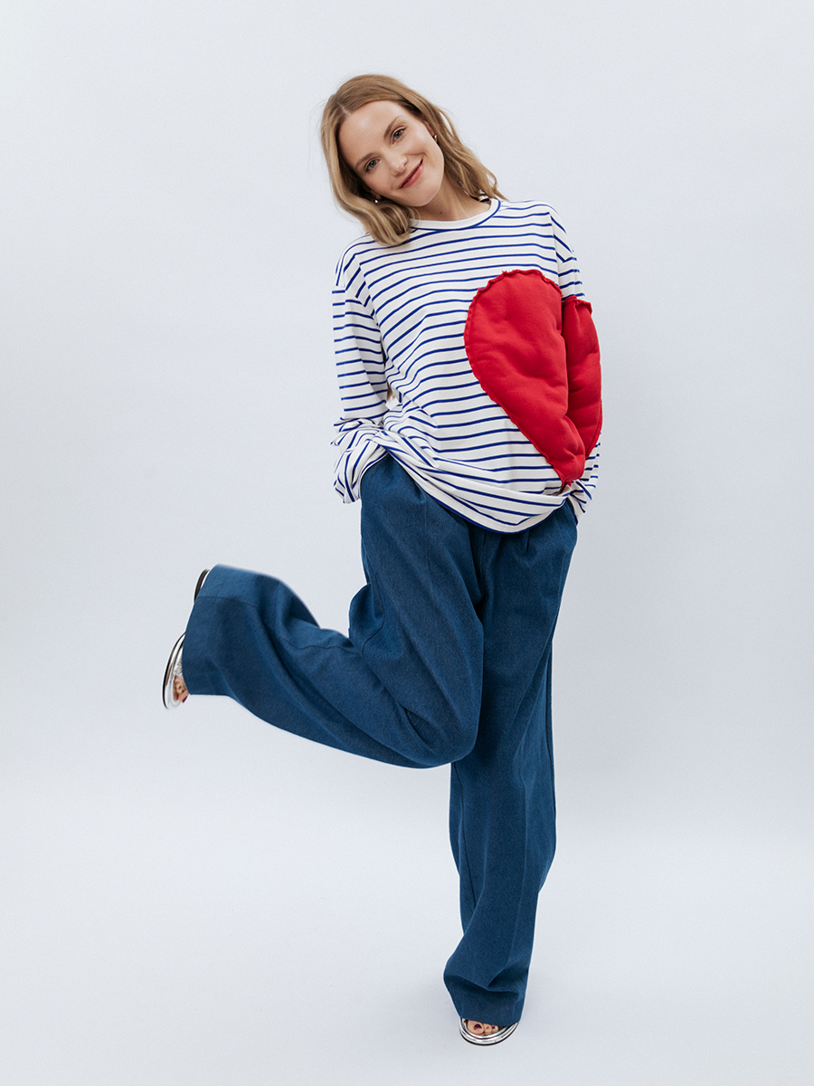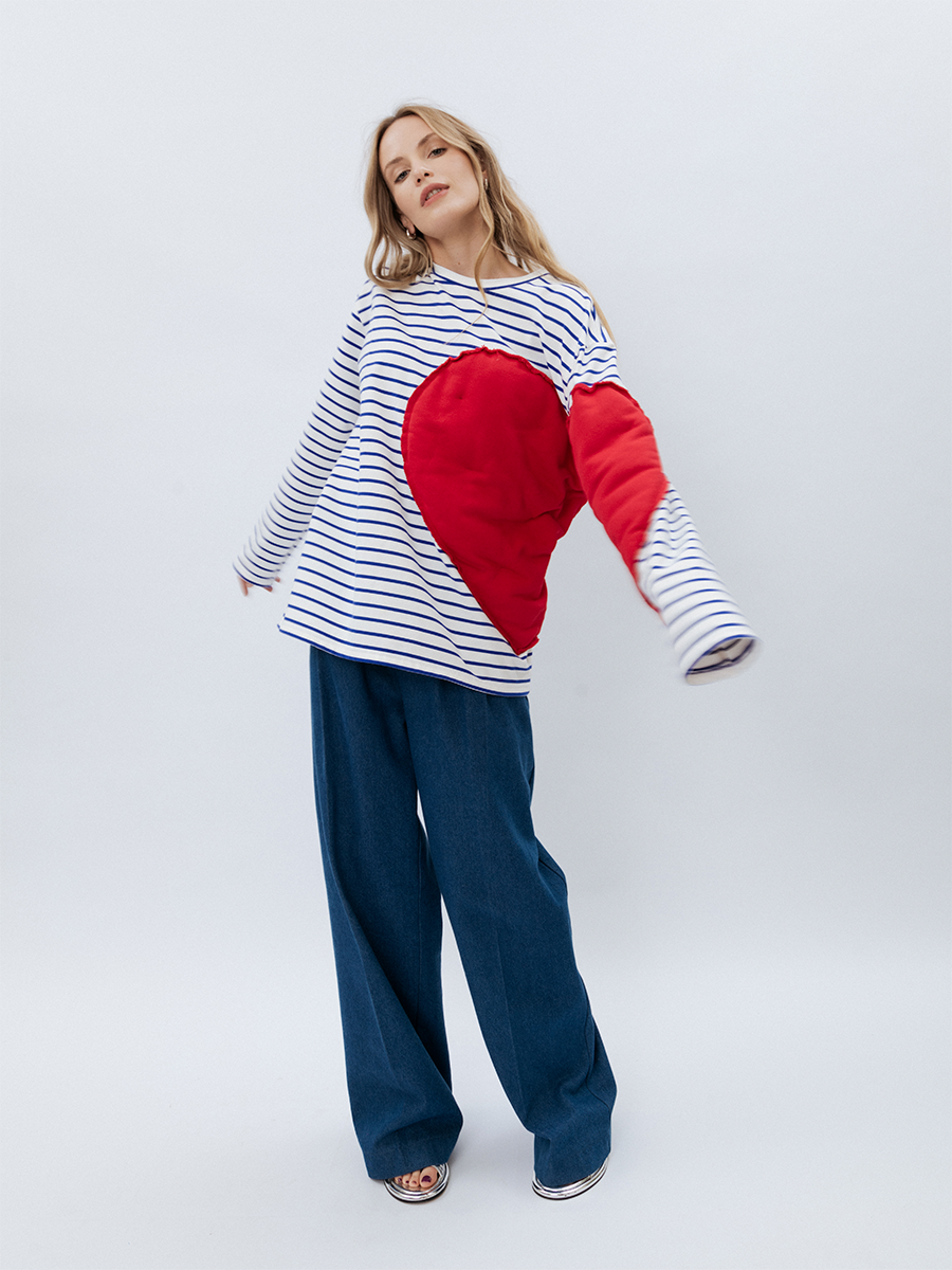 Тельняшка, выполненная из качественного материала, сочетает классический морской стиль с оригинальным дизайнерским решением. На груди расположено огромное вышитое красное сердце, символизирующее страсть и силу, которое, не ограничиваясь полотном ткани, смело переходит на рукав, словно обнимая обладательницу. Этот принт становится манифестом любви к жизни и индивидуальности.